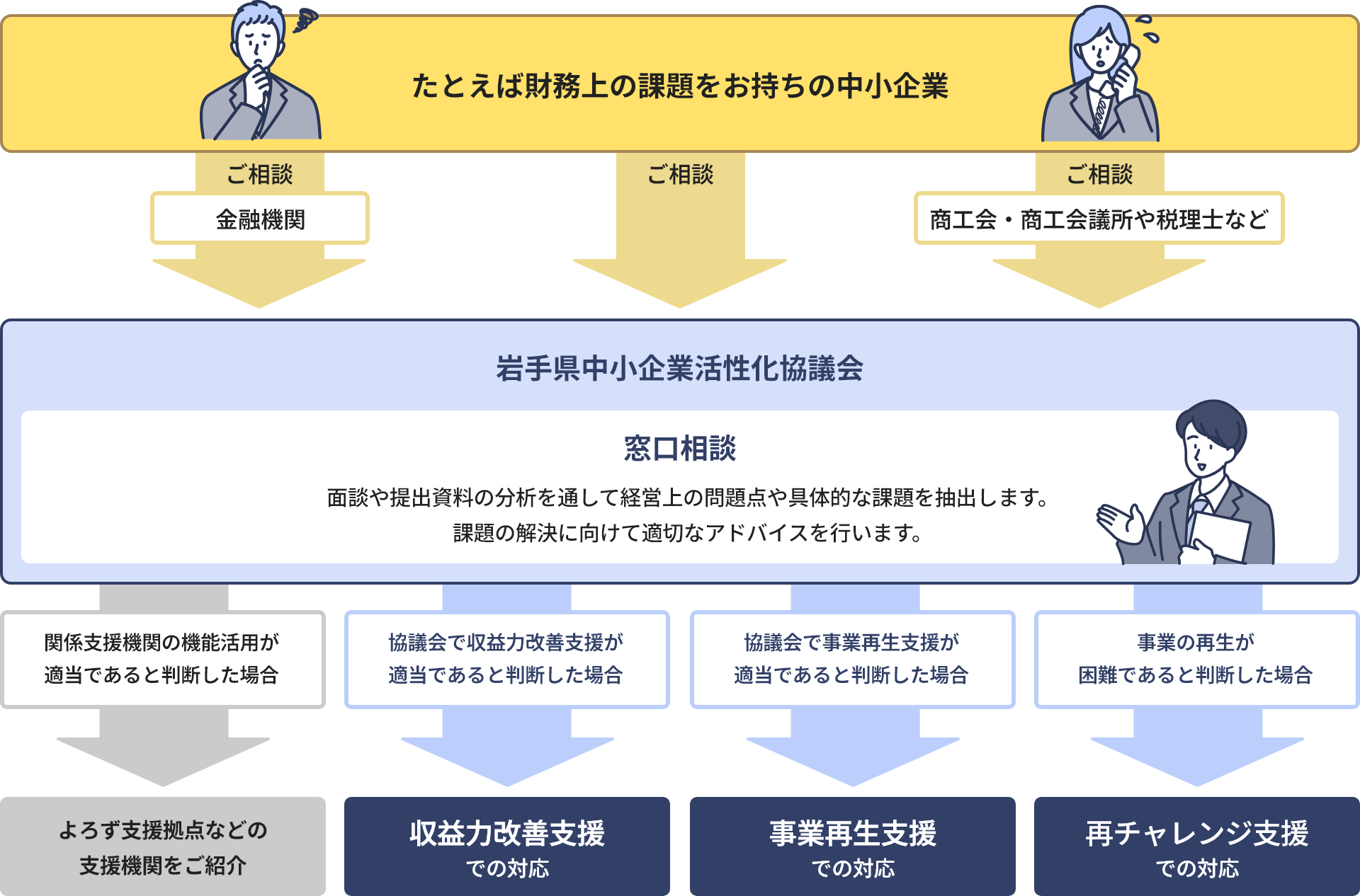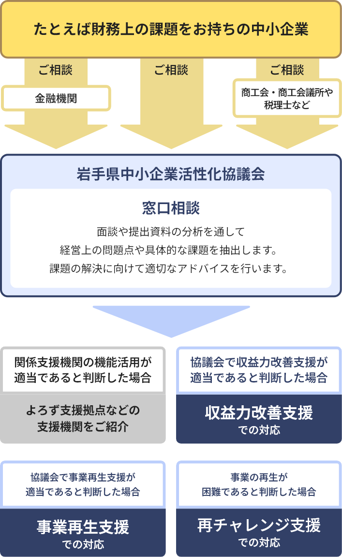 「中小企業活性化協議会」は、経営環境の悪化しつつある県内中小企業の再生を支援するための機関です。 中小企業者の収益力改善、経営改善、事業再生、再チャレンジを一元的に支援することを目的としています。 盛岡商工会議所が国の委託を受けて運営する、公正中立な機関です。 (※直接のご融資の相談に応じる支援機関ではございませんので、予めご了承ください)